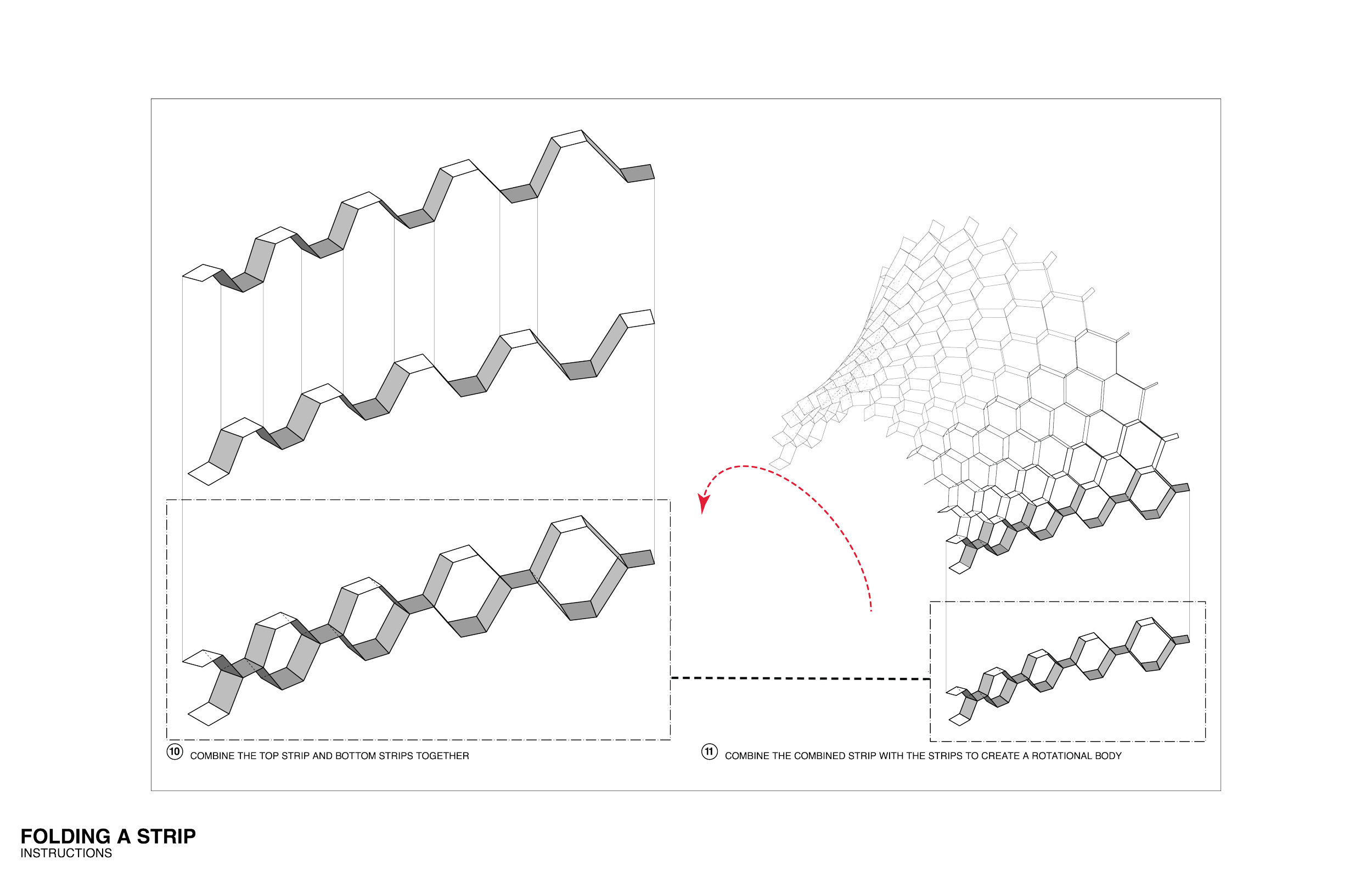 The studio built upon Rubert Maleczek’s Ph.D thesis, an exploration of the relationship between form, structure, performance, and material. This experiment is conducted through an algorithm using a linear strip folded along two planar surfaces. These modular strips are duplicated and rotated to form a 360* rotational body.